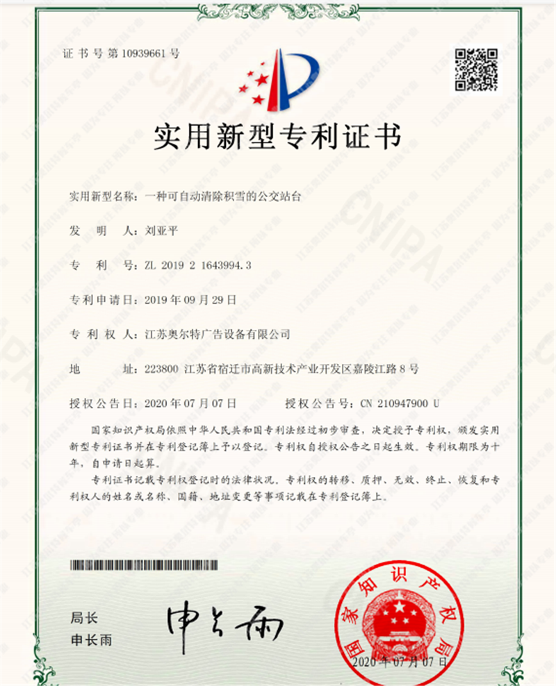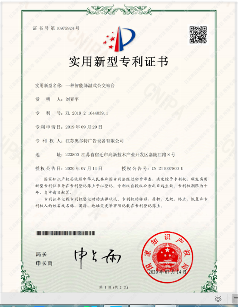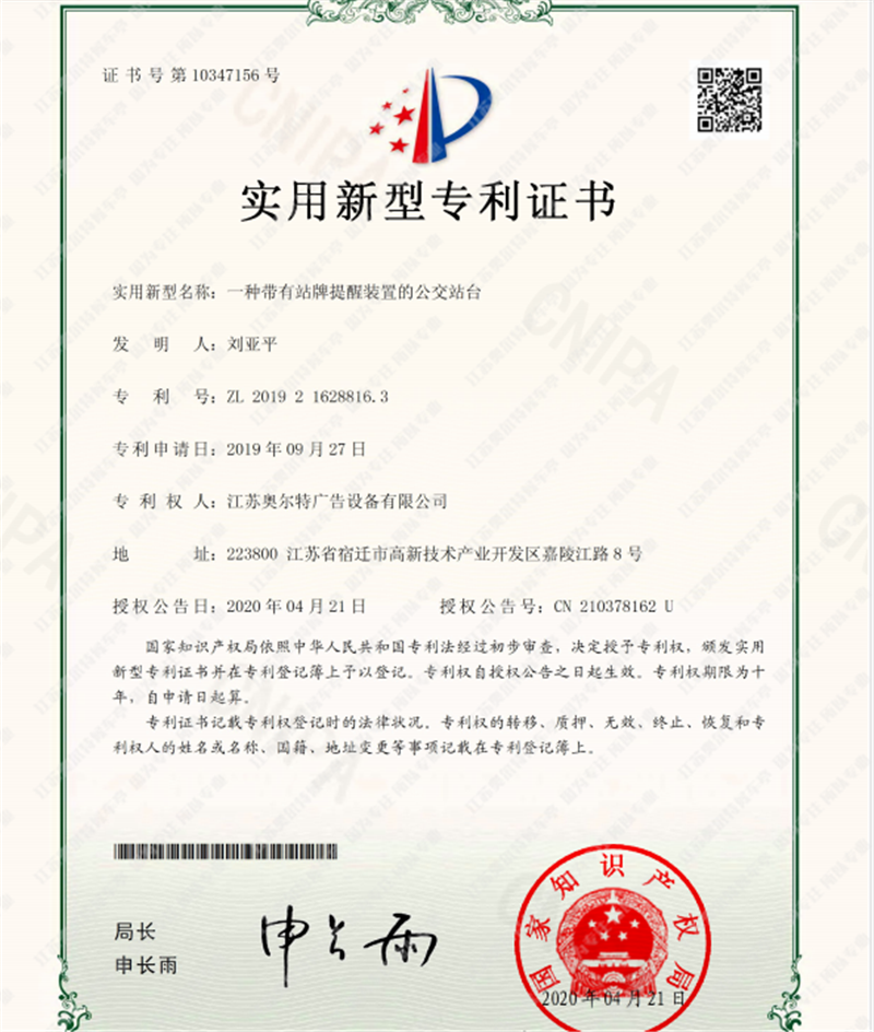 喜報------江(jiāng)蘇国产亚洲熟妇在线视频自(zì)主研發公交站台專利證書