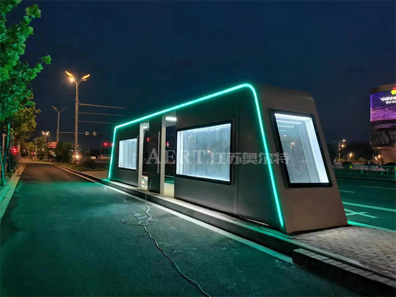 此款智能化外觀時尚大氣,顏色采用科技灰,湖藍色氛圍燈遍布整座候車亭,不僅為城市(shì)增添美感,也為夜晚候車的市民帶來了光亮,