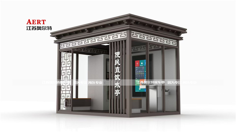 這是一座便(biàn)民直飲水亭,中式風格的設計融入傳統回紋、鏤空雕花元素,深棕框架搭配通透玻璃,典雅又現代。亭內集成直飲水設(shè)備,滿足路人(rén)隨時補水需求;智能交互(hù)屏可查詢信息、了解水(shuǐ)質,還設有(yǒu)休憩區。它將實用功能與文化審美結合,既是街頭解(jiě)渴站點,也是傳遞人文溫度的城市小品,讓匆忙腳步能在此暫歇,感受便利與詩意交融的美好 。